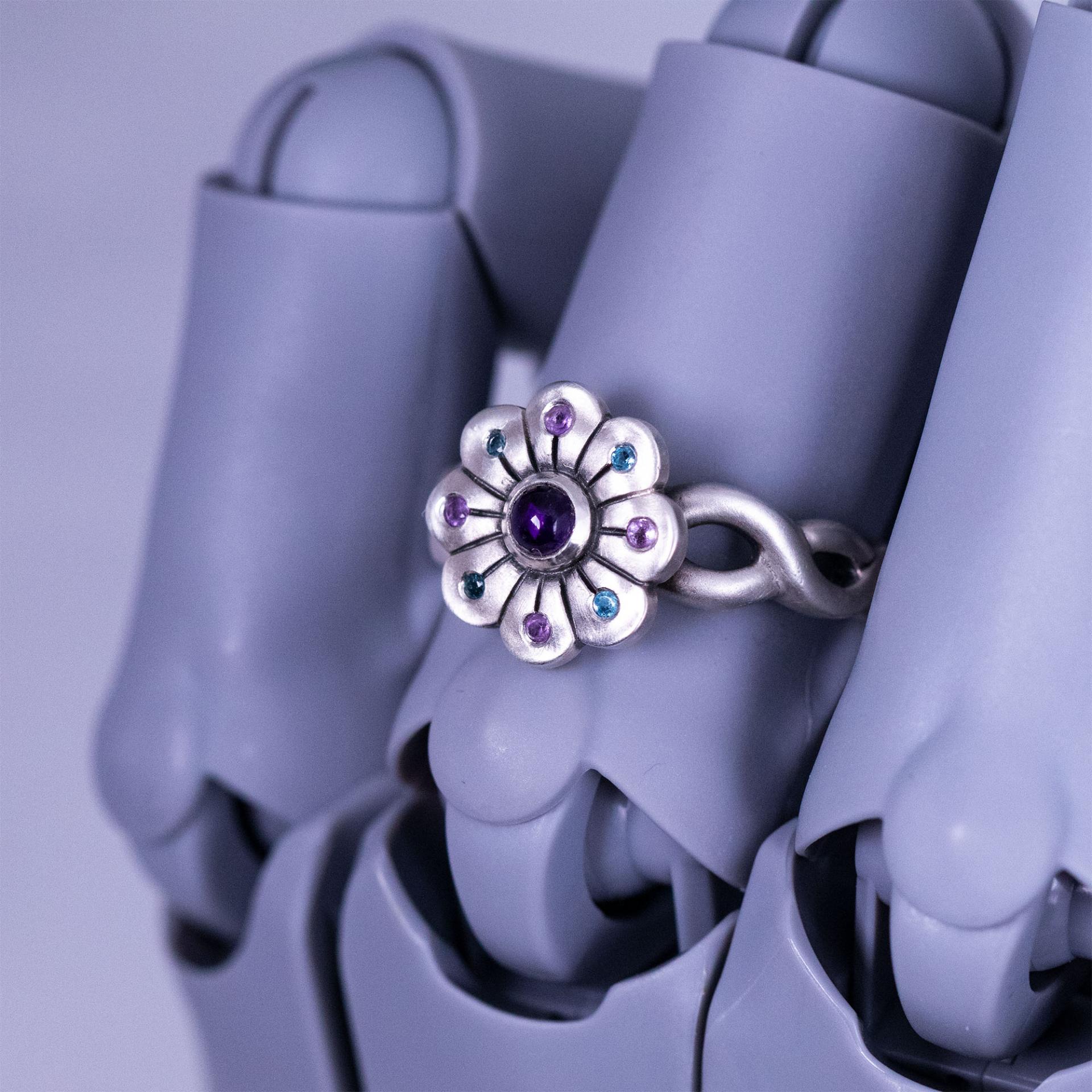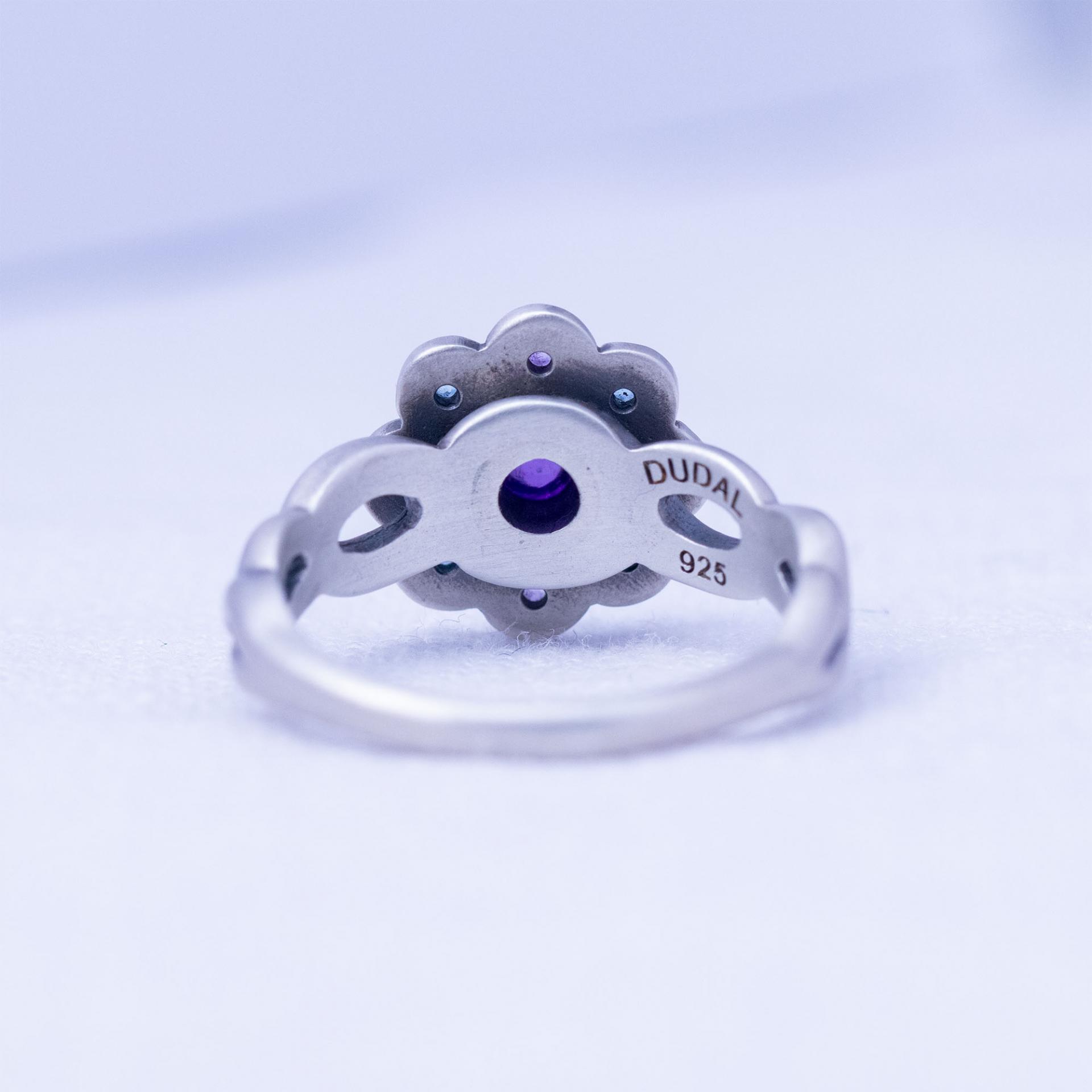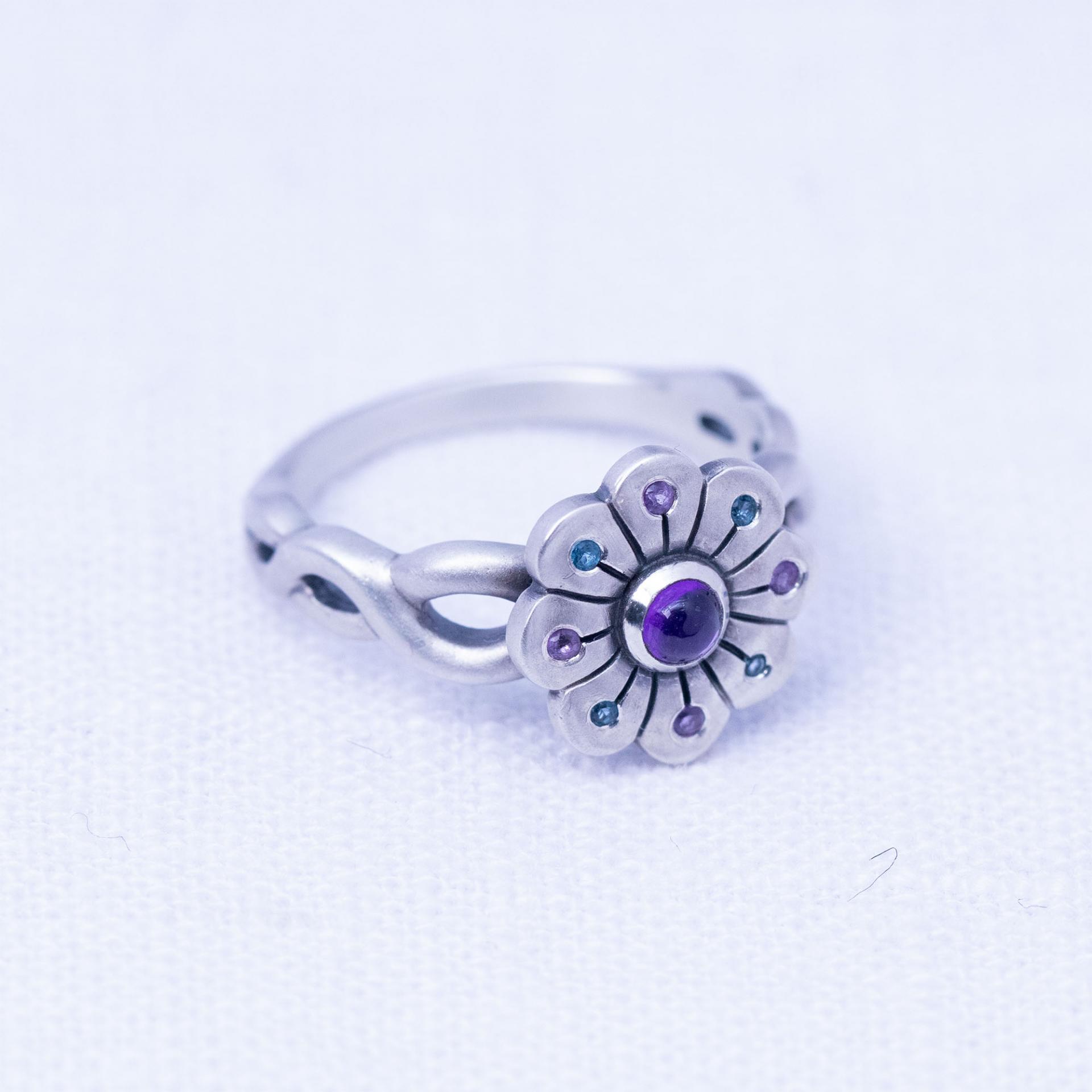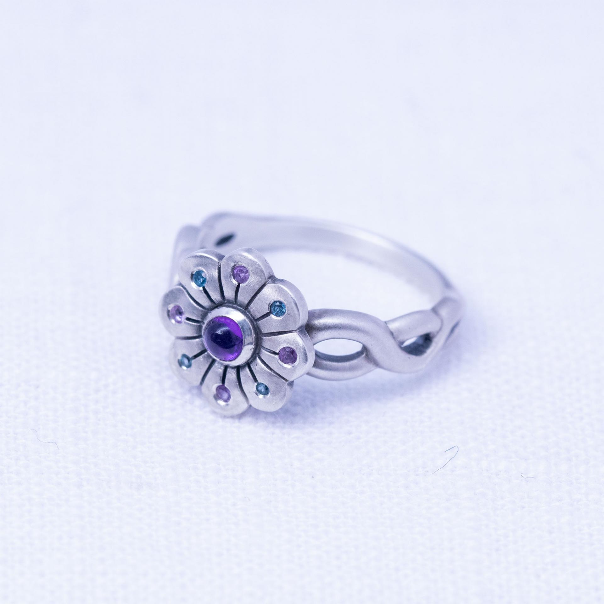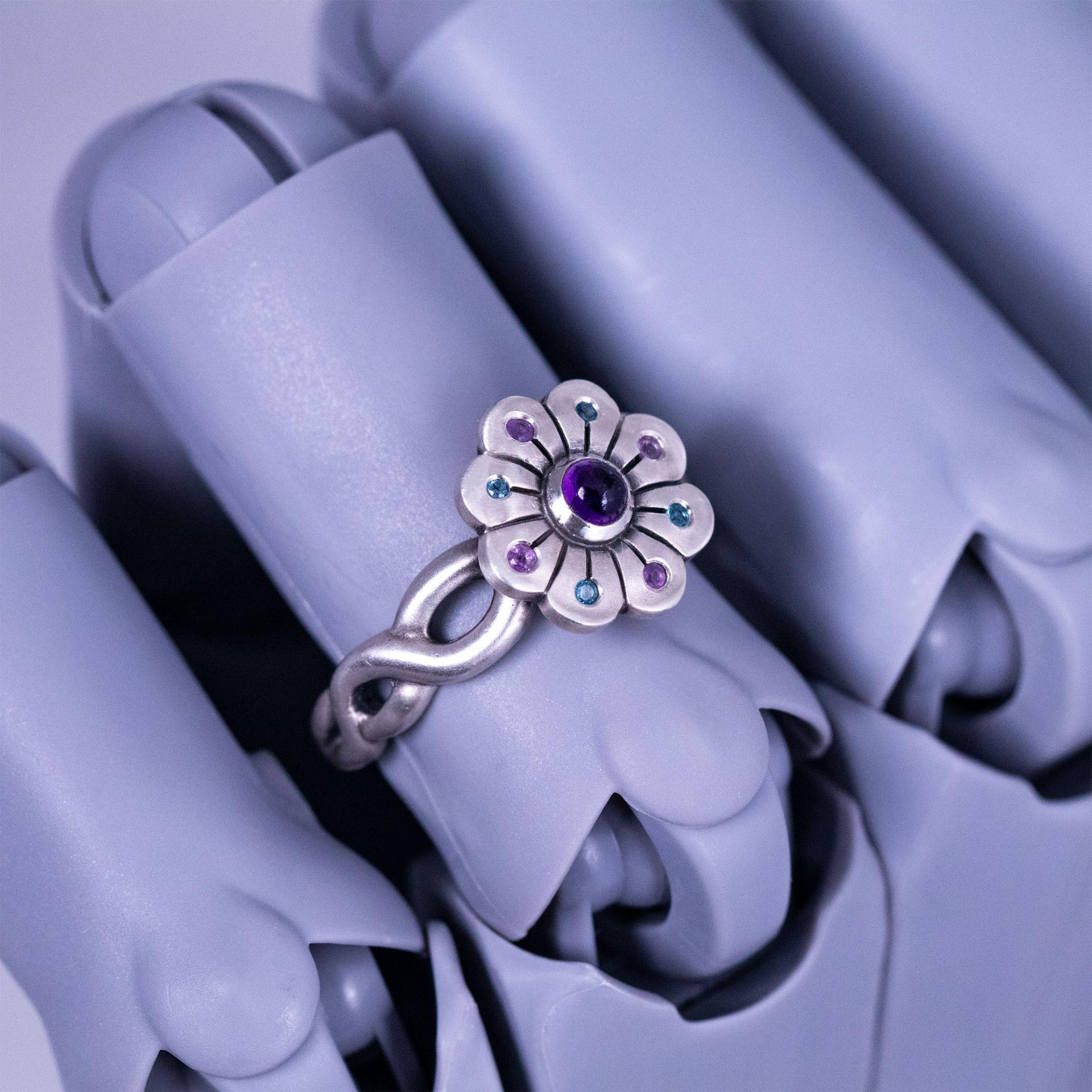 At the center, a deep purple amethyst is set, complemented by London blue topaz and additional amethysts on the sides. Amethyst symbolizes wisdom and tranquility, while London blue topaz enhances a sense of calm and stability, bringing the wearer balance and positive energy.