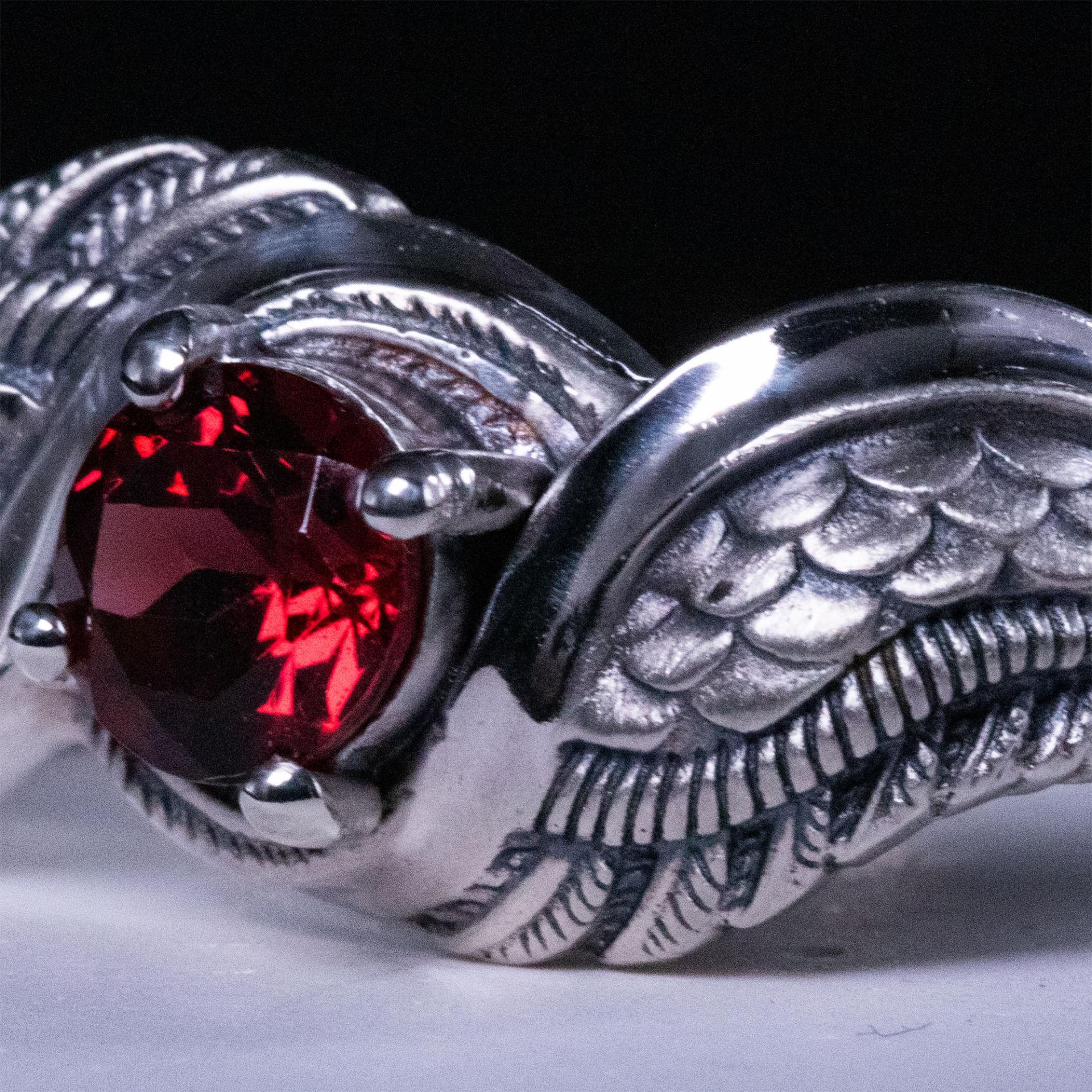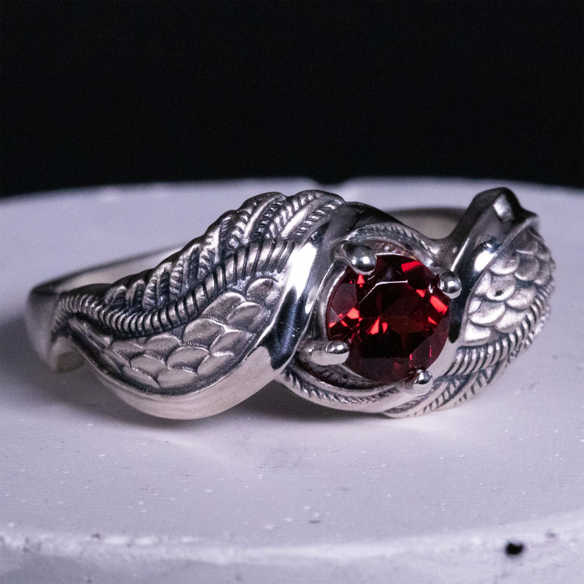 At the center, a deep red garnet represents the fiery spirit of the Vermilion Bird, radiating strength and vitality. The intricately carved feather patterns reflect the dynamic movement of this celestial creature, allowing the wearer to carry its powerful presence.