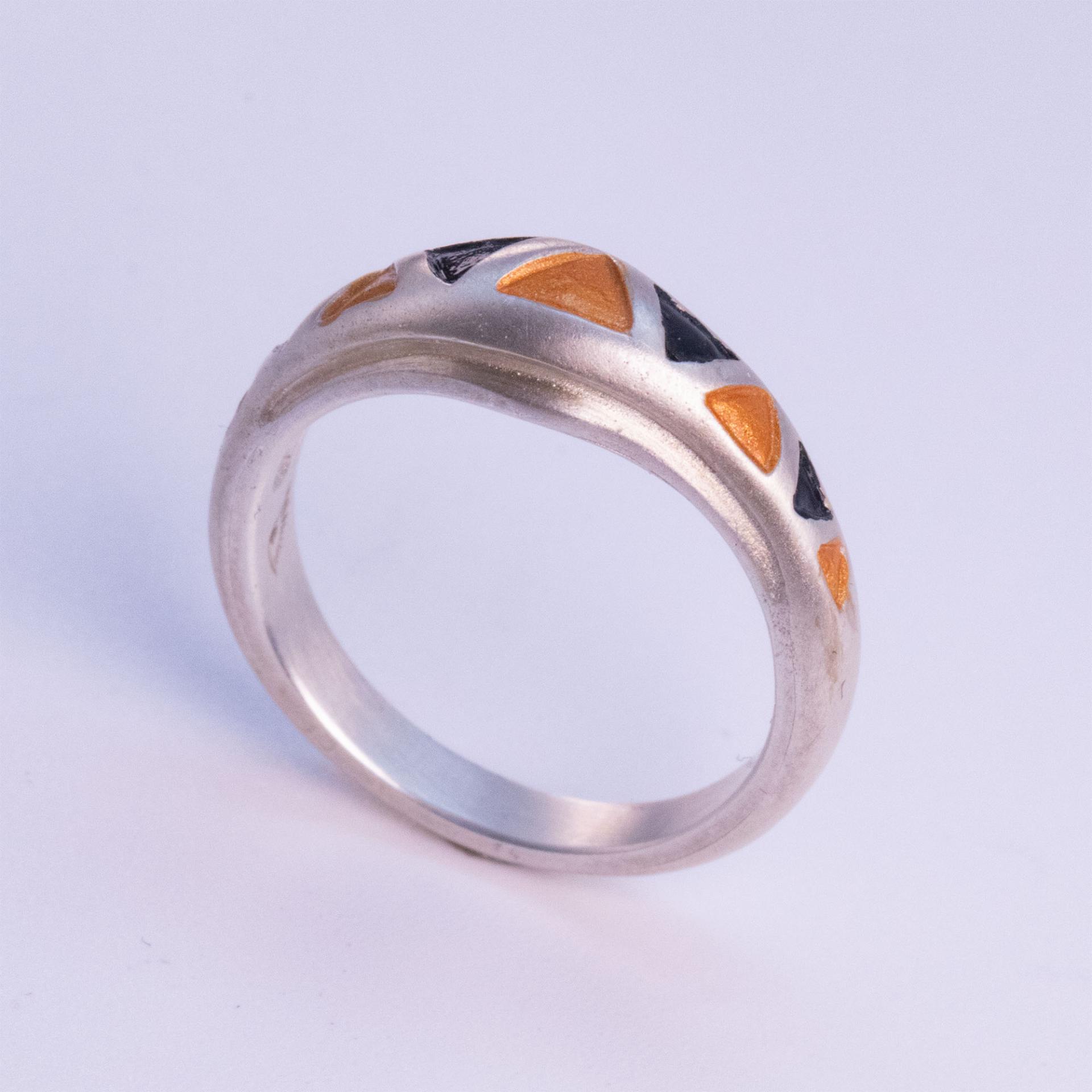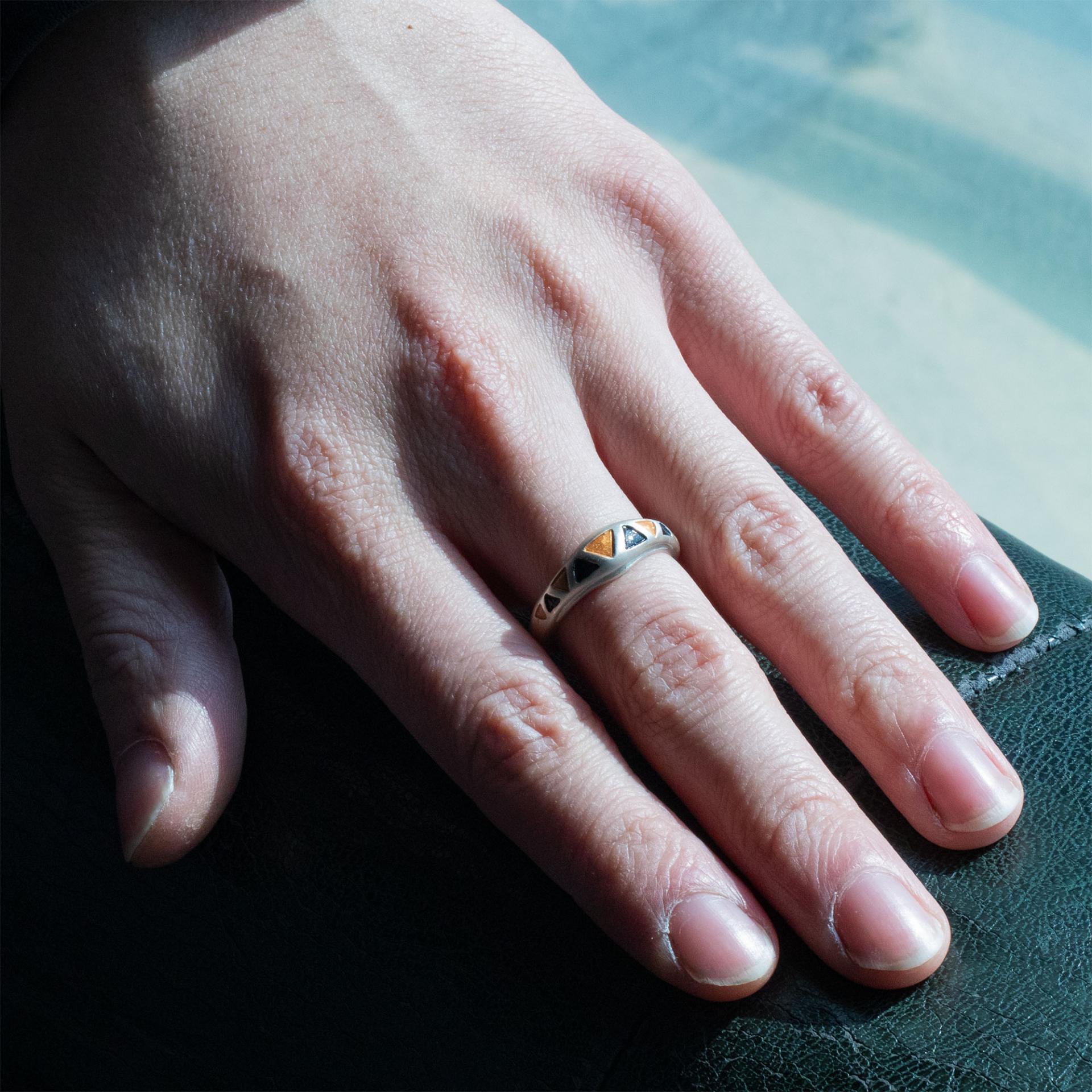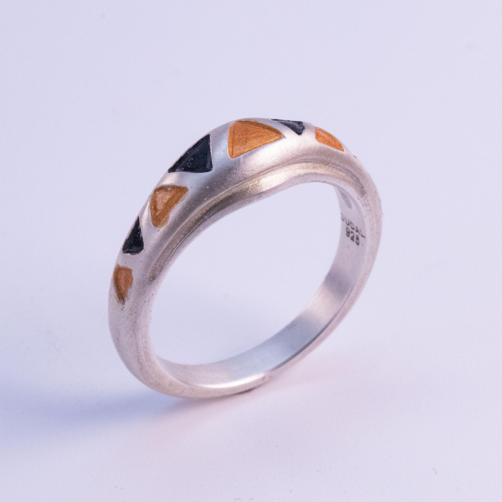 This ring is inspired by the artwork of Gustav Klimt. His signature triangular patterns and color combinations have been reinterpreted with a modern touch, carefully arranged and refined in a harmonious design.