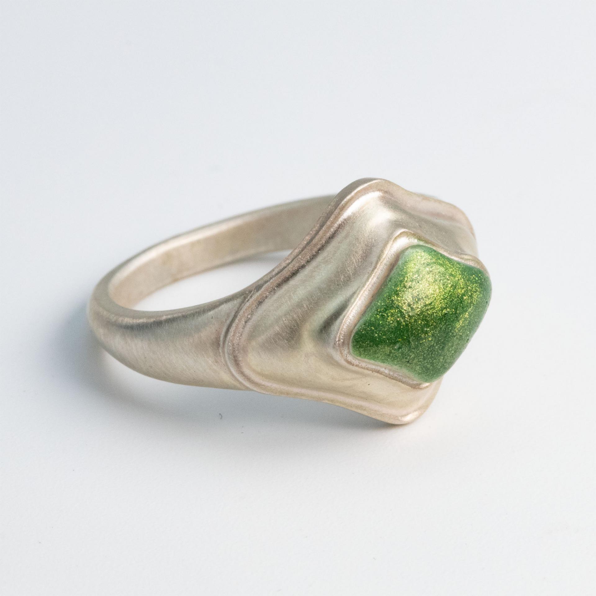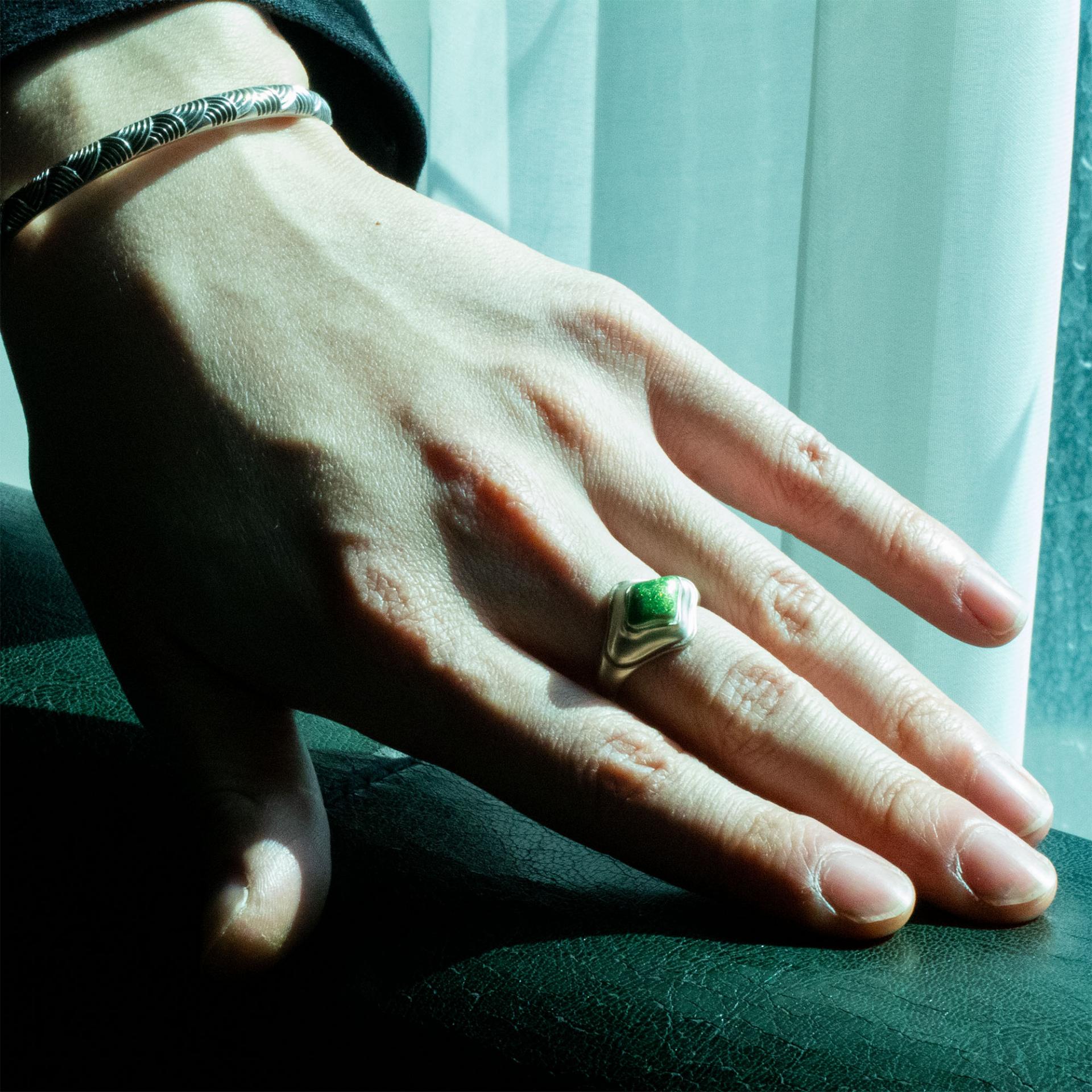 Inspired by Gaudí’s architectural curves, this design emphasizes organic shapes and volume, resulting in a soft yet dimensional form. The subtly raised focal point ensures a bold yet wearable piece for everyday use.