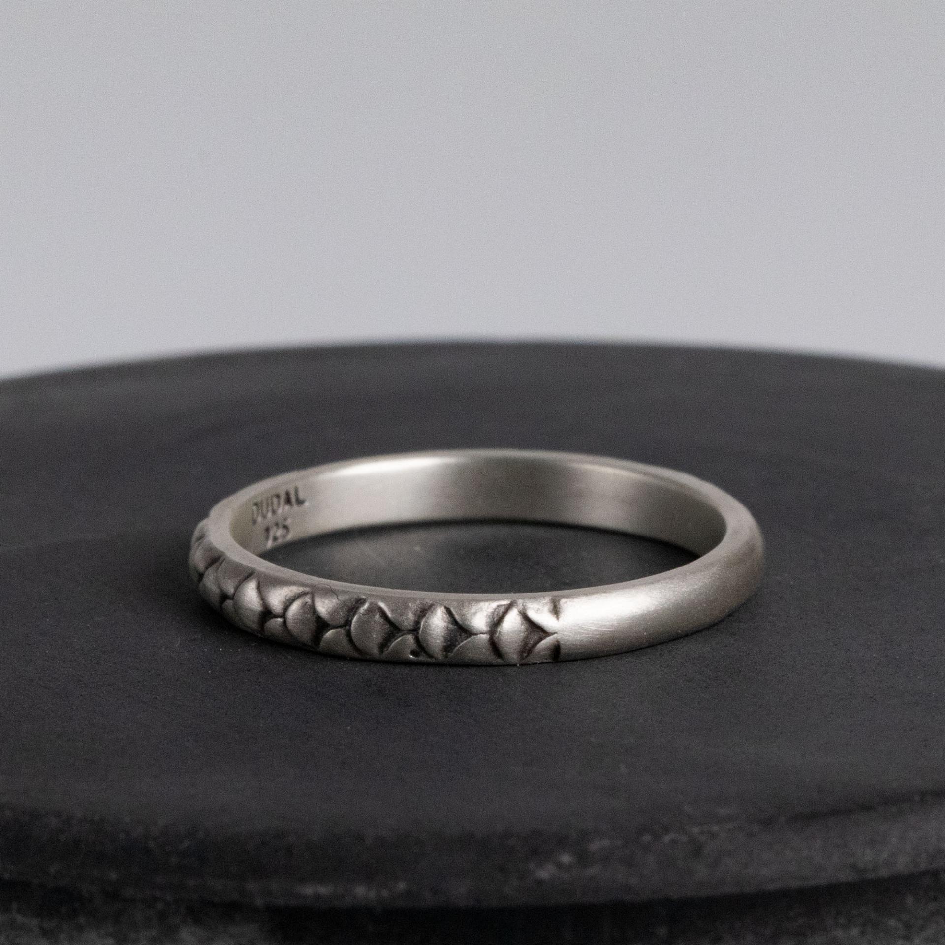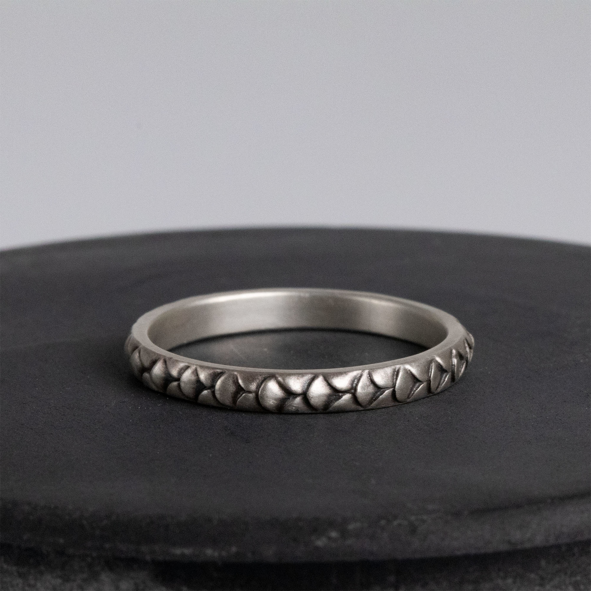 Inspired by the delicate pattern of koi fish scales, this ring features a slim silhouette designed for subtle everyday elegance.